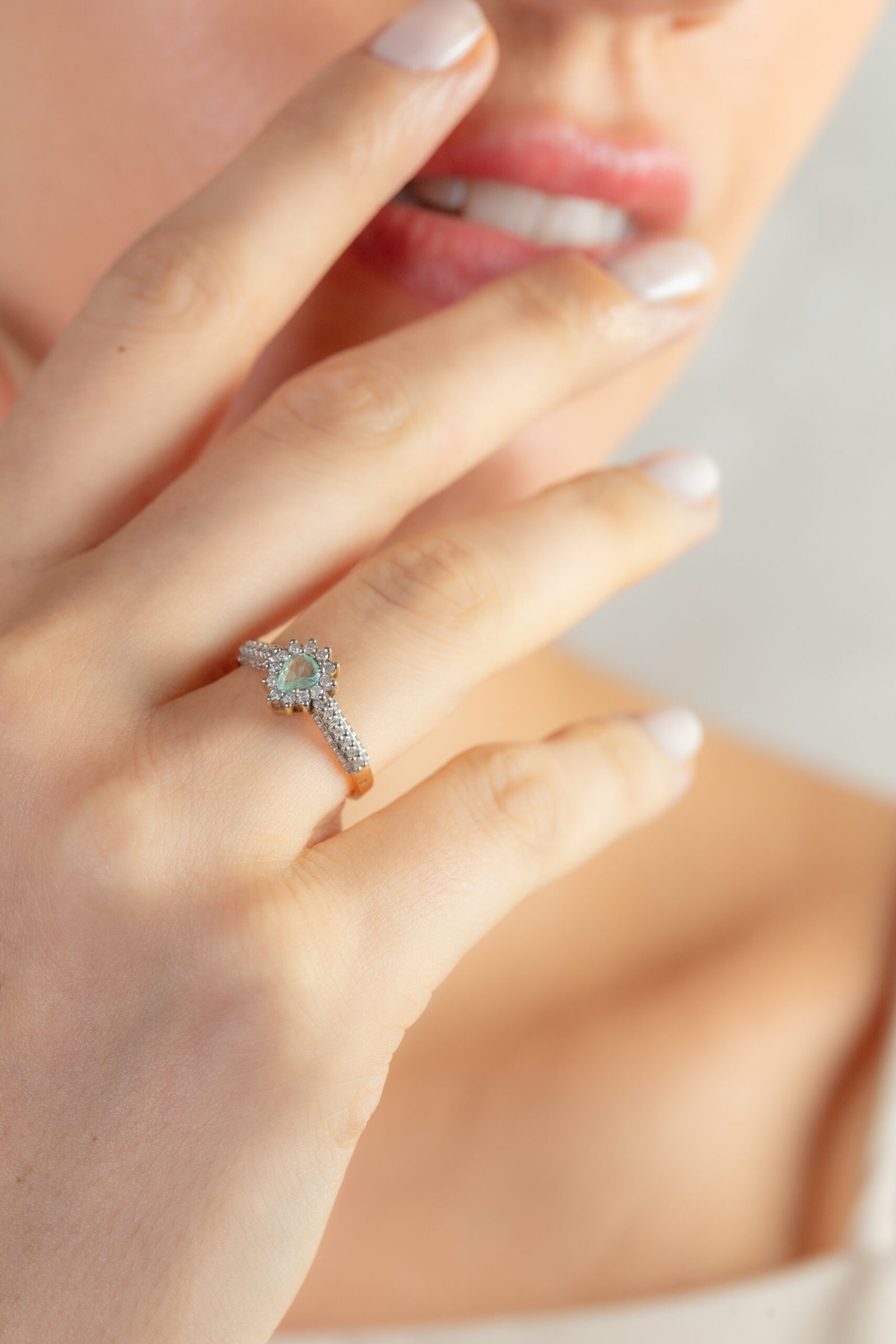 Anel Ouro 18k com Gema Natural Turmalina Paraíba lapidação Gota e aro cravejado com 40 pontos de Diamantes