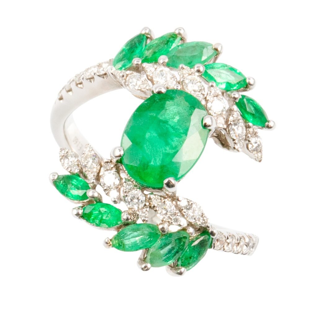 Anel Ouro Branco 18k com Esmeraldas e Diamantes