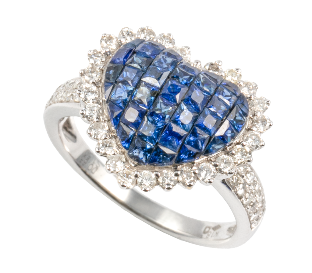 Anel Ouro Branco 18k Coração com Safiras e 65 pontos de Diamantes