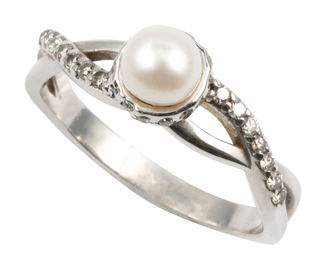 Anel Ouro Branco 18k Pérola Natural e Aro Torcido com 31 pontos de Diamantes