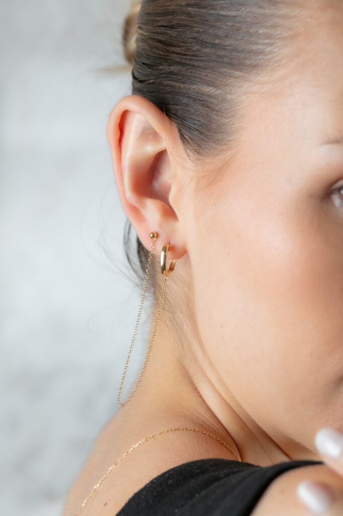 Brinco Ouro 18k Duplo Argola com corrente portuguesa e Bolinha – 14cm